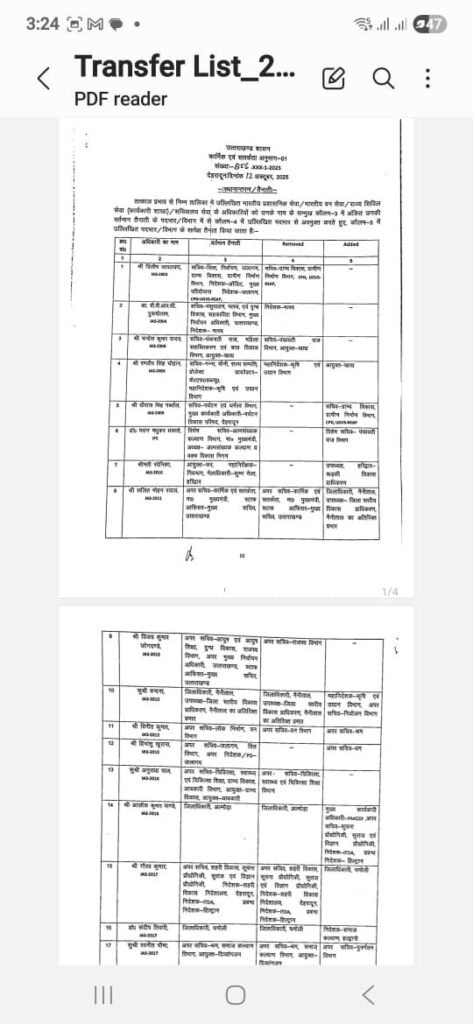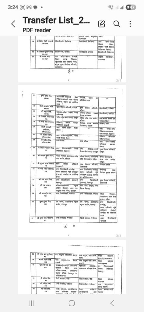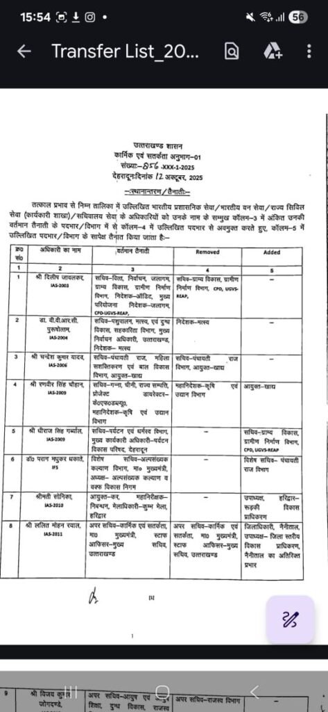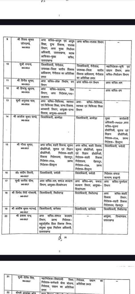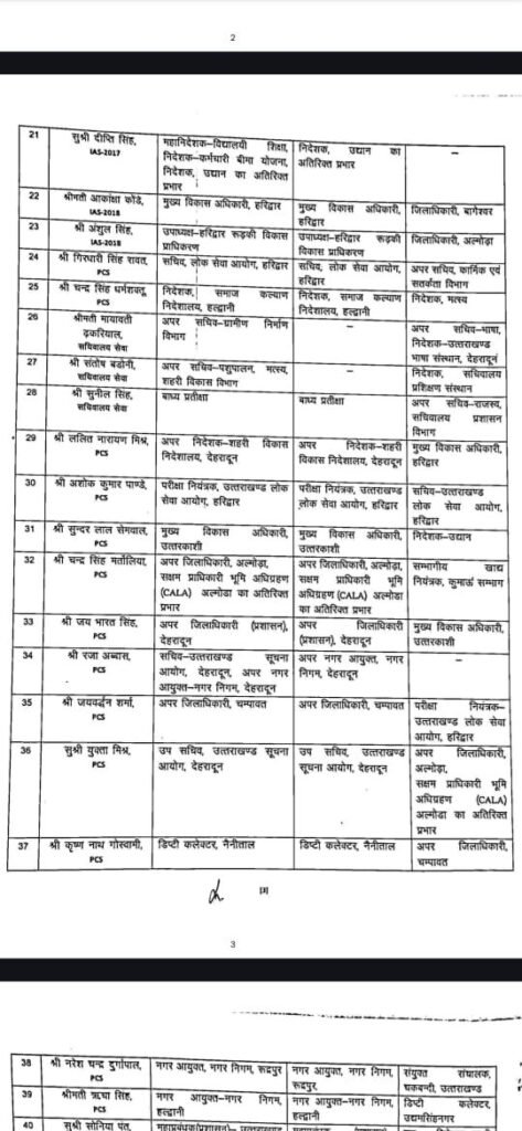राजकुमार / उत्तराखण्ड / देहरादून। सरकार ने उत्तराखंड में बड़ा प्रशासनिक फेरबदल करते हुए 44 आईएएस और पीसीएस के ट्रांसफर कर दिए हैं। कुंभ मेलाधिकारी सोनिका को हरिद्वार-रूड़की विकास प्राधिकरण के उपाध्यक्ष का जिम्मा सौंपा गया है और पूर्व में हरिद्वार में सेवाएं दे चुके ललित नारायण मिश्र को मुख्य विकास अधिकारी बनाया गया है। HRDA के उपाध्यक्ष अंशुल सिंह को अल्मोड़ा का जिलाधिकारी और मुख्य विकास अधिकारी आकांक्षा कोंडे को बागेश्वर का जिलाधिकारी बनाया गया है। देखें लिस्ट…