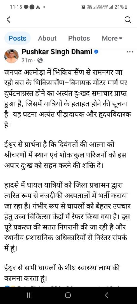 राजकुमार / उत्तराखण्ड / अल्मोड़ा। मुख्यमंत्री शपुष्कर सिंह धामी ने जनपद अल्मोड़ा में भिकियासैंण से रामनगर जा रही बस के भिकियासैंण-विनायक मोटर मार्ग पर दुर्घटनाग्रस्त होने की घटना पर गहरा शोक व्यक्त किया है।