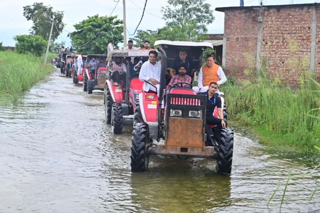 राजकुमार / हरिद्वार /लक्सर। राज्य में जारी भारी बारिश और प्राकृतिक आपदा के चलते उत्पन्न संकट की स्थिति के बीच मुख्यमंत्री पुष्कर सिंह धामी मंगलवार को सबसे पहले हरिद्वार जिले के लक्सर आपदा प्रभावित क्षेत्रों में पहुँचे। कठिन परिस्थितियों को दरकिनार करते हुए मुख्यमंत्री ने ट्रैक्टर के माध्यम से ग्रामीण और जलमग्न क्षेत्रों तक पहुँचकर स्थलीय निरीक्षण किया और प्रभावित परिवारों से सीधे संवाद कर उनकी समस्याएं जानीं।